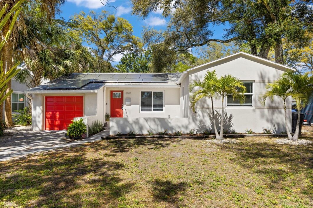 Explore this charming find in Woodlawn Estates! Nestled on a peaceful dead-end street, this beautifully renovated home has plenty to offer. Charming front porch/courtyard is a perfect spot for a couple of chairs and a glass of wine at the end of a day. Enjoy the tranquility of a residential neighborhood while still having easy access to I-275. Inside, discover practical stainless steel appliances, including a refrigerator, dishwasher, oven with a range, and a microwave hood, all complemented by stylish modern cabinets and countertops. The three bedrooms are filled with natural light. The fenced backyard is perfect for pets, social gatherings, and maybe even a future pool. Solar panels installed in 2022 to keep your AC bill nice and low even during the Florida summer heat. Just a short drive away, you’ll find all the essentials like restaurants, stores, schools, and the vibrant Downtown St. Pete!